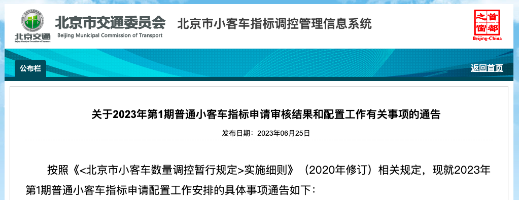 ? ? ? 審核(含復核)結(jié)果已于2023年5月25日公布,申請人可登陸北京市小客車指標調(diào)控管理信息系統(tǒng)或到各區(qū)對外辦公窗口查詢審核結(jié)果。