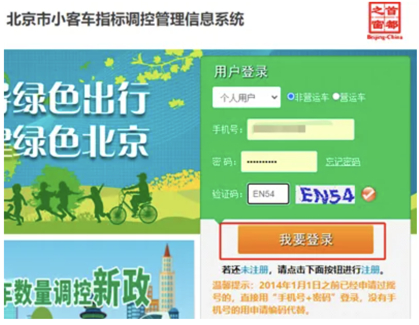 第一步:打開北京市小客車指標(biāo)調(diào)控管理信息系統(tǒng),輸入手機(jī)號、密碼后,點擊【我要登錄】按鈕登錄系統(tǒng)。
