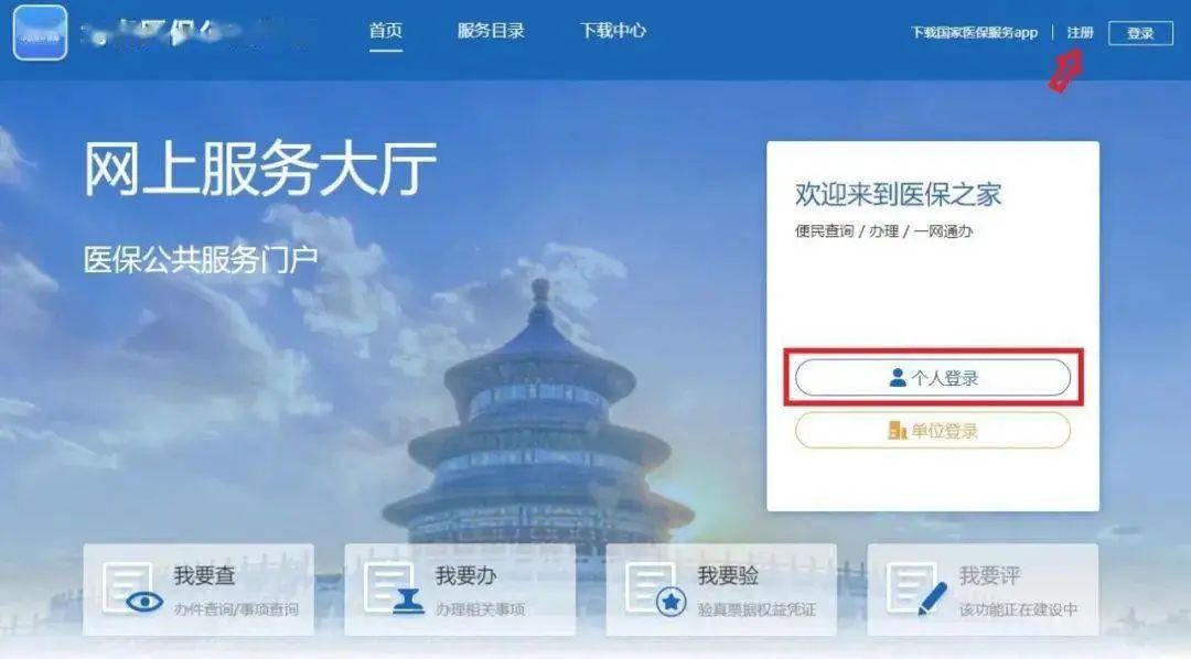 1、登錄“北京醫(yī)保公共服務(wù)”網(wǎng)上服務(wù)大廳,選擇【個(gè)人登錄】進(jìn)入個(gè)人賬號登錄界面;如您首次登錄,請先點(diǎn)擊【注冊】進(jìn)行個(gè)人賬戶注冊。